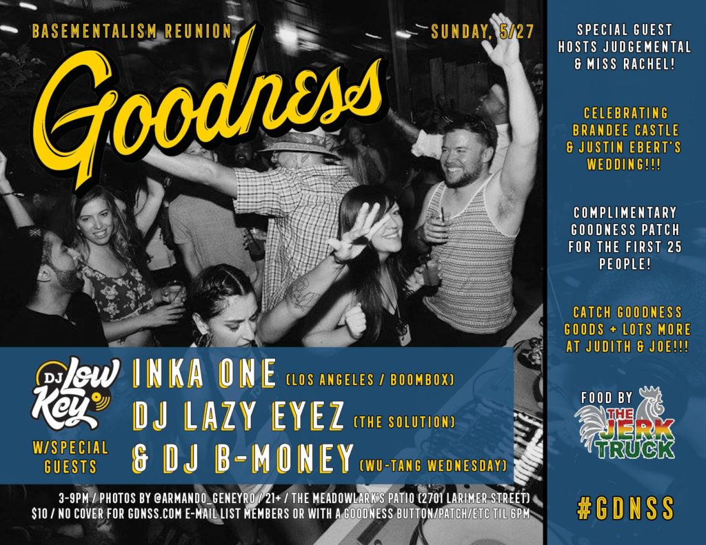 Posted on May 24, 2018May 24, 2018Sunday, 5/27 at 3pm -> Basementalism Reunion Goodness w/DJ Low Key and special guests Inka One (LA/Boombox), DJ Lazy Eyez & DJ B-Money!!! Special guest hosts Judgemental & Miss Rachel, complimentary #GDNSS patch for the first 25 people & lots more on The Meadowlark’s magical patio! Join the e-mail list at GDNSS.com or wear a Goodness button/pin/etc to skip the $10 cover until 6pm… Early arrival recommended, especially with the holiday on Monday….