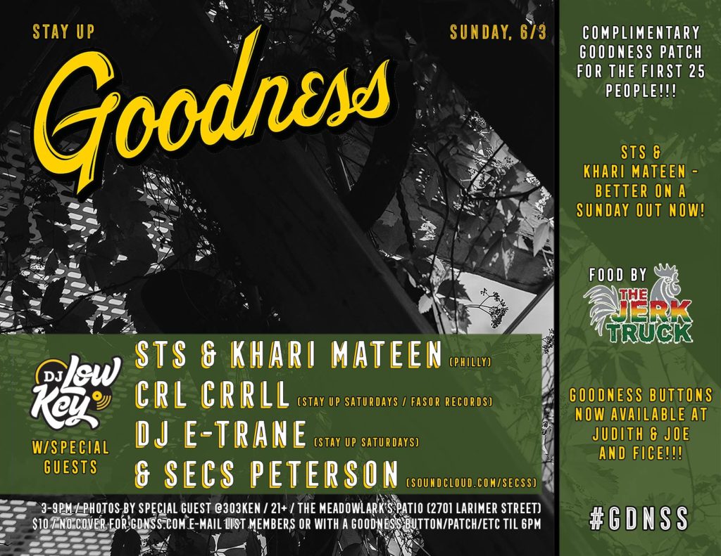 Posted on May 31, 2018June 2, 2018Sunday, 6/3 at 3pm -> Stay Up Goodness w/DJ Low Key & special guests STS x Khari Mateen (Philly), CRL CRRLL, DJ E-Trane & Secs Peterson!!! Photos by guest IG: @303Ken, complimentary #GDNSS patch for the first 25 people & lots more on The Meadowlark’s magical patio! Join the e-mail list at GDNSS.com or wear a Goodness button/pin/etc to skip the $10 cover until 6pm…
