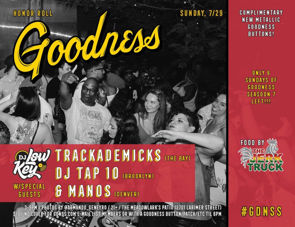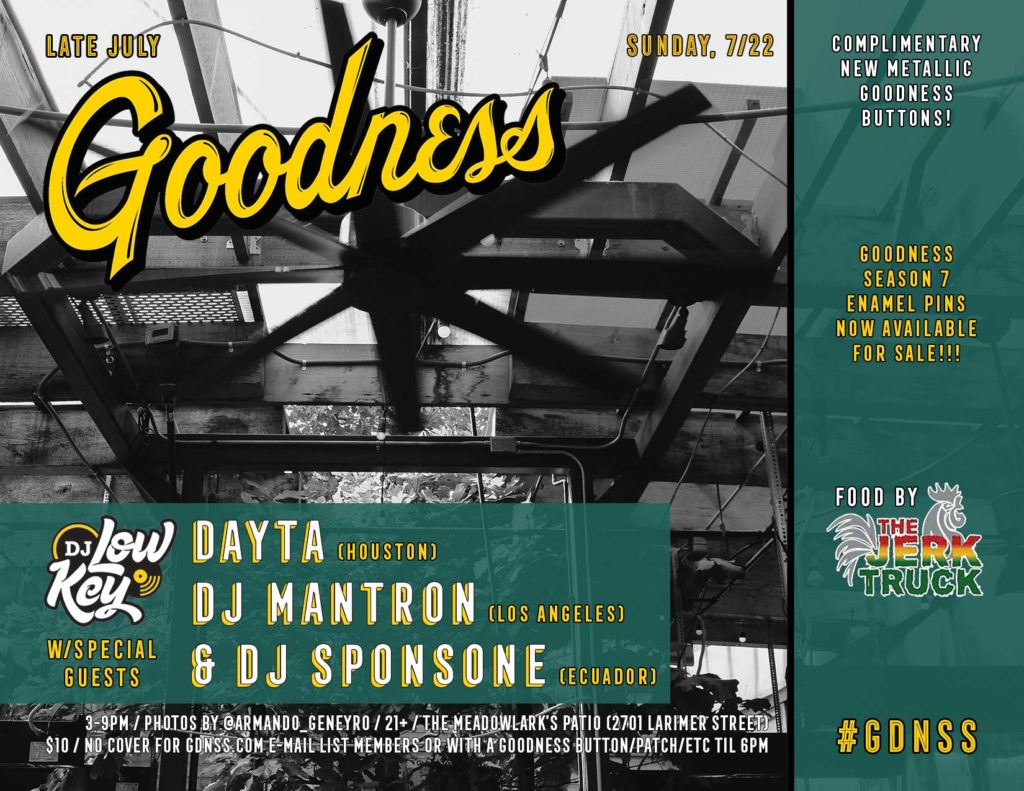 Sunday, 7/22 at 3pm -> Late July Goodness w/DJ Low Key and special guests Dayta, DJ Mantron & DJ SponsOne!!! Complimentary new metallic #GDNSS buttons, food by The Jerk Truck, photos by IG: @Armando_Geneyro & lots more on The Meadowlark’s magical patio!