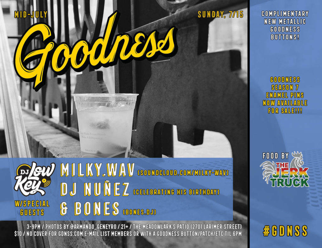 Sunday, 7/15 at 3pm -> Mid-July Goodness w/DJ Low Key and special guests Milky.WAV, DJ Nuñez & Bones!!! Complimentary new metallic #GDNSS buttons, food by The Jerk Truck, photos by IG: @Armando_Geneyro & lots more on The Meadowlark’s magical patio!