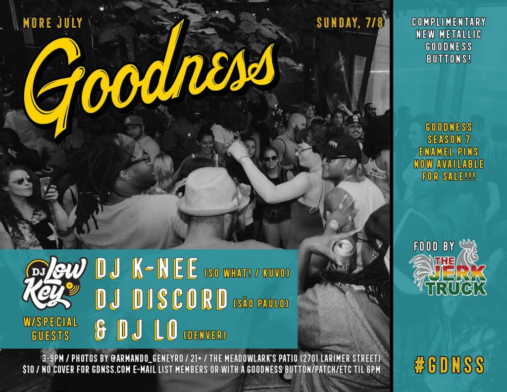 Sunday, 7/8 at 3pm -> More July Goodness w/DJ Low Key and special guests DJ K-Nee, DJ Discord & DJ Lo!!! Complimentary new metallic #GDNSS buttons, food by The Jerk Truck, photos by IG: @Armando_Geneyro & lots more on The Meadowlark’s magical patio!