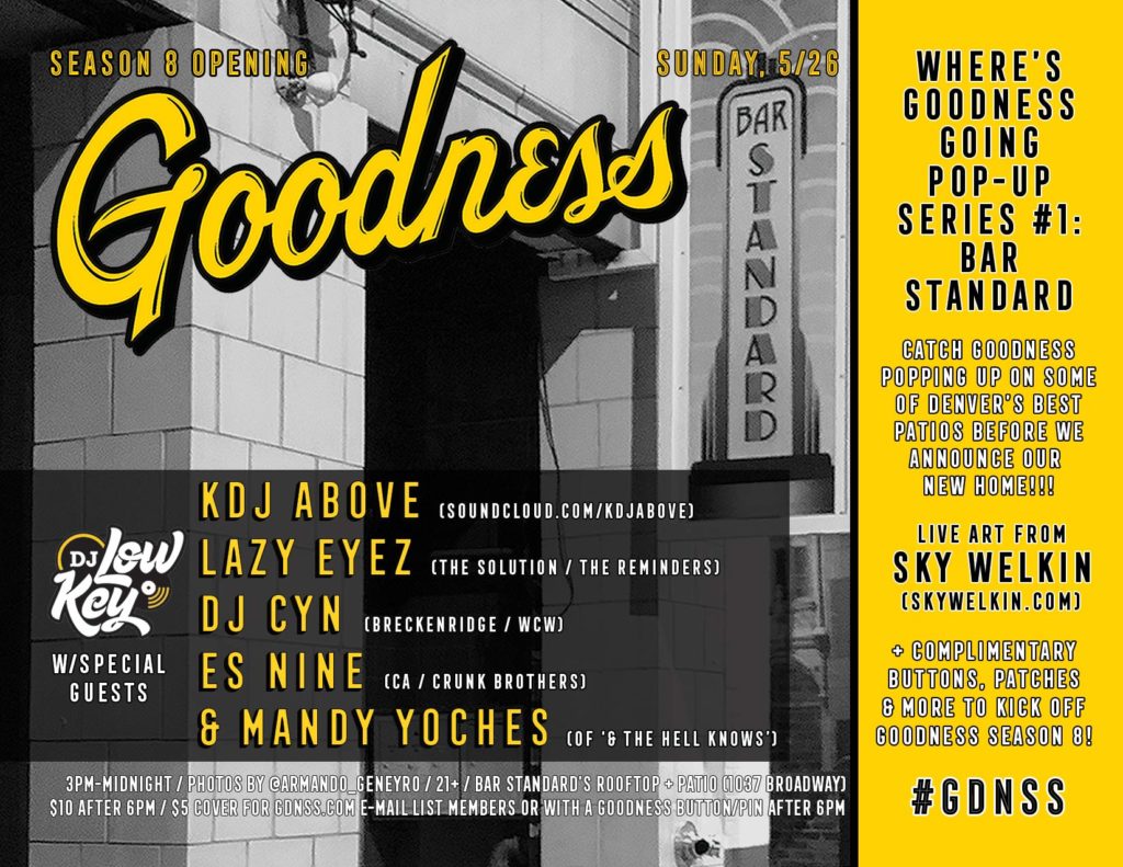 Posted on May 24, 2019Sunday, 5/26 from 3pm to midnight -> #WheresGoodnessGoing Pop-Up #1 on Bar Standard’s Rooftop w/DJ Low Key & special guests KDJ Above, DJ Lazy Eyez, DJ Cyn, Es Nine & a special performance from Mandy Yoches!!! Live art from Sky Welkin, photos by Armando Geneyro & more to kick off season 8!