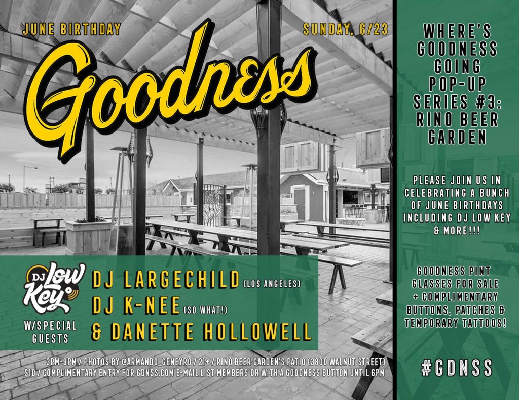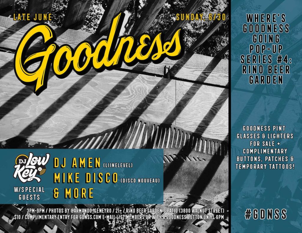 Sunday, 6/23 at 3pm -> #WheresGoodnessGoing Pop-Up #3 on RiNo Beer Garden’s patio w/DJ Low Key and special guests DJ Largechild, DJ K-Nee & Danette Hollowell!!! Goodness pint glasses, photos by IG @Armando_Geneyro, complimentary buttons/stickers/temporary tattoos & more as we celebrate a bunch of June birthdays!