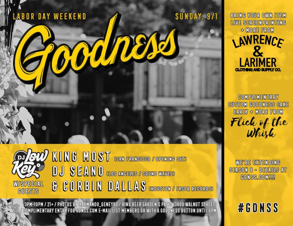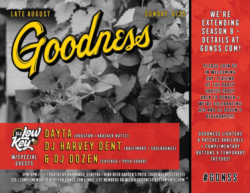 Sunday, 8/25 at 3pm -> Late August Goodness w/DJ Low Key and special guests Dayta (Houston), DJ Harvey Dent (Baltimore) & DJ Dozen (Chicago) on RiNo Beer Garden’s Patio!!! Goodness patches/lighters available, photos by IG @Armando_Geneyro, complimentary buttons/stickers/temporary tattoos & more!