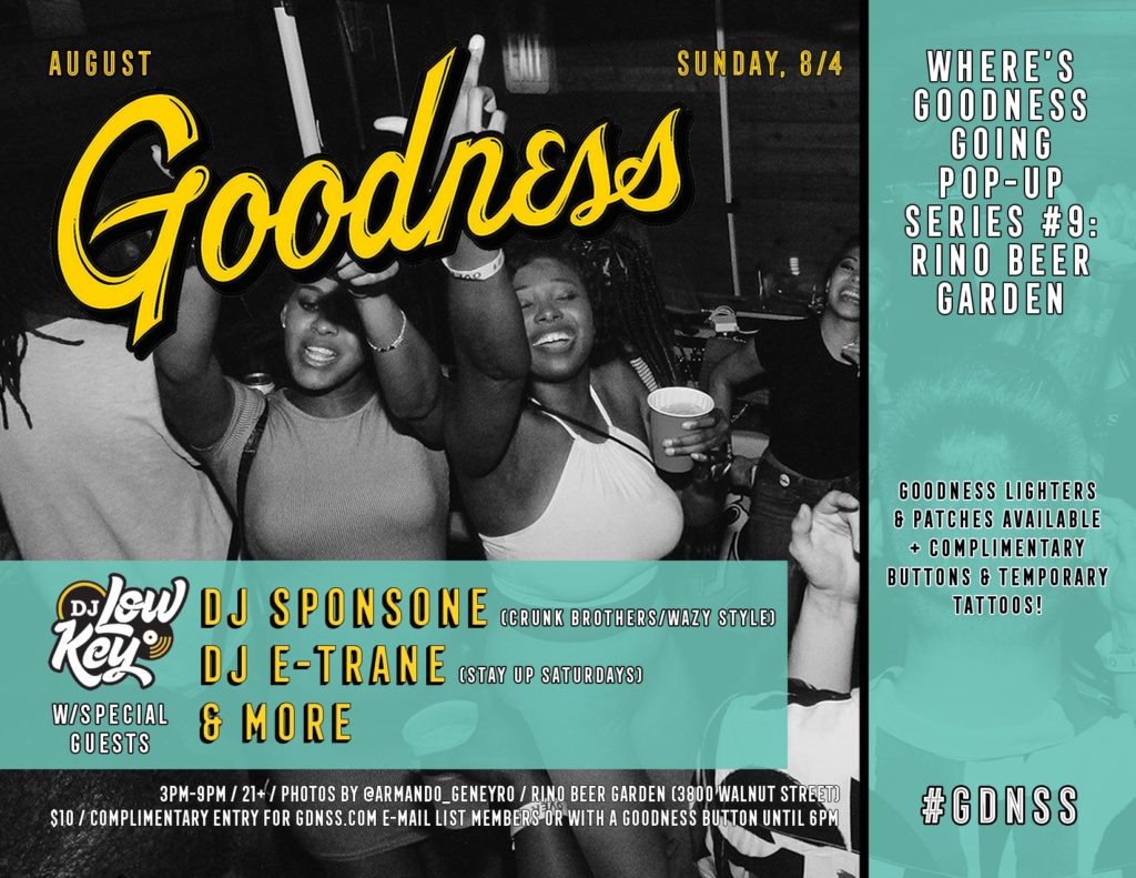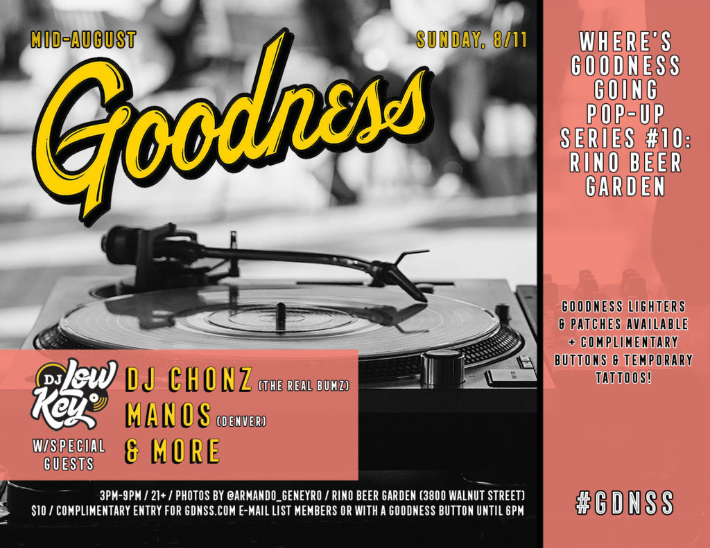 Sunday, 8/4 at 3pm -> #WheresGoodnessGoing Pop-Up #9 w/DJ Low Key and special guests DJ SponsOne, DJ E-Trane+more on RiNo Beer Garden’s Patio!!! Goodness patches/lighters available, photos by IG @Armando_Geneyro, complimentary buttons/stickers/temporary tattoos & more!