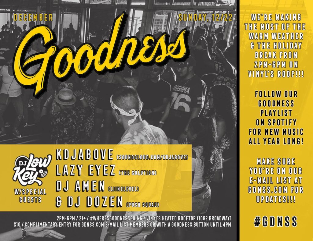 SUNDAY, 12/22 from 2-6pm -> Yep yep, you read that right. With the great weather, we’re teaming up with Vinyl for one last Goodness to close out the decade on their heated rooftop.