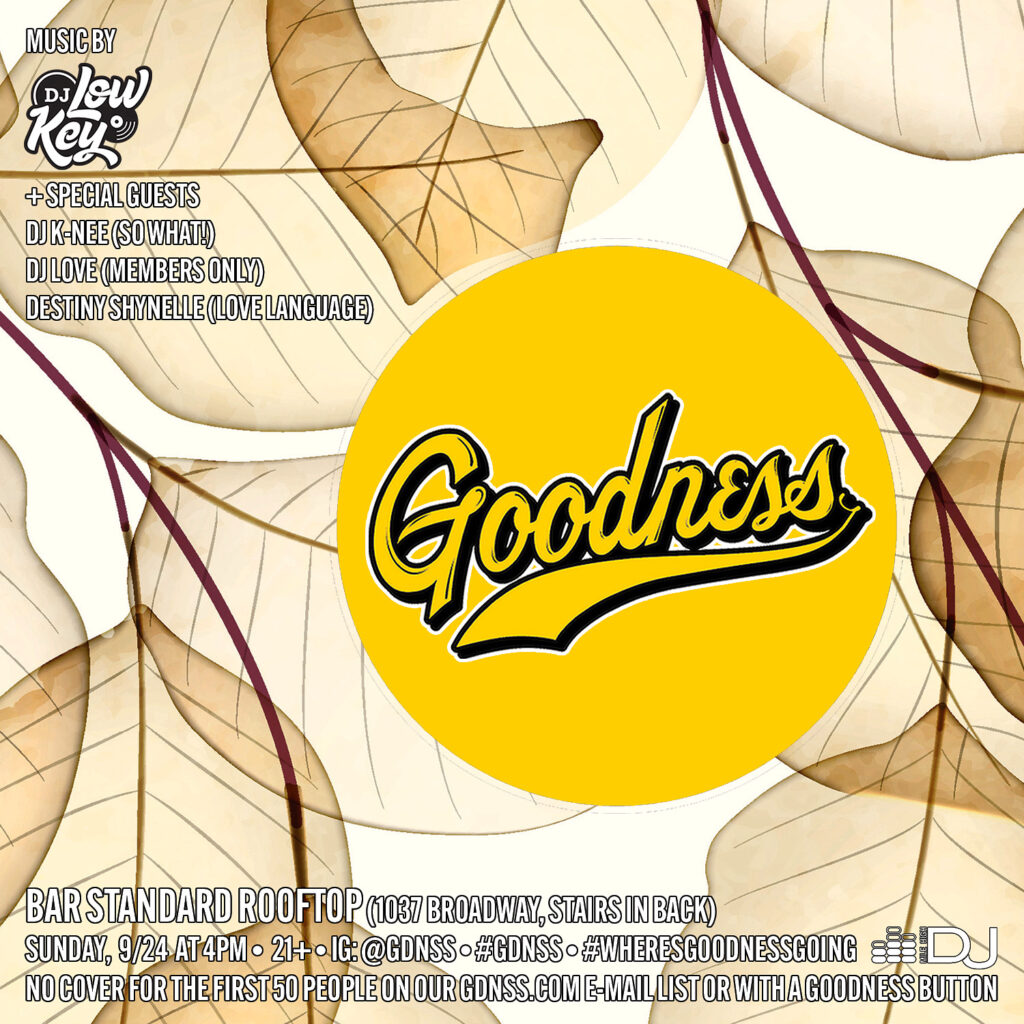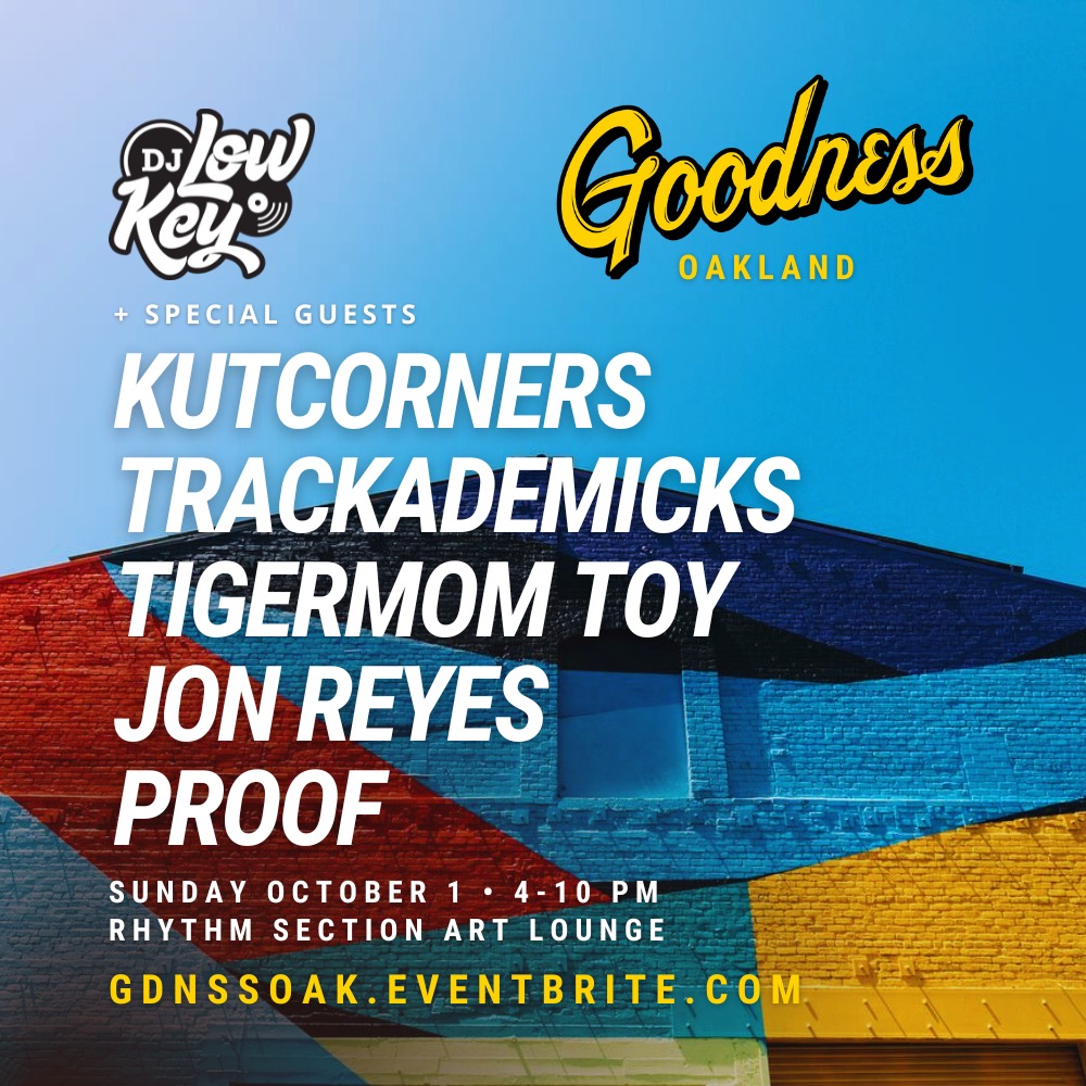 Sunday, 10/1 at 4pm -> Goodness Oakland w/ DJ Low Key + special guests Kutcorners, Trackademicks, Tigermom Toy, Jon Reyes & Proof on the Rhythm Section’s rooftop!!! New merch, complimentary 2023 #GDNSS buttons, aguas frescas & more…