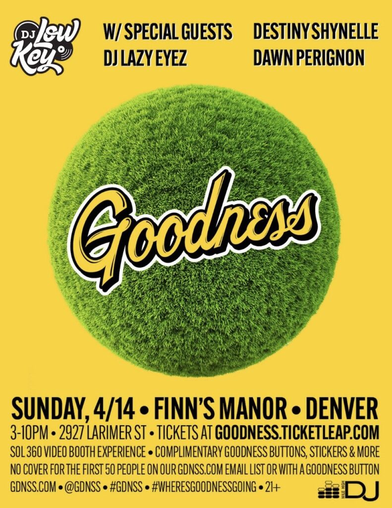 Posted on March 15, 2024April 12, 2024Sunday, 4/14 at 3pm -> Goodness Spring Training Denver w/ DJ Low Key & special guests DJ Lazy Eyez, Destiny Shynelle + Dawn Perignon at Finn’s Manor! Plus The Sol 360 Video Booth Experience, complimentary Goodness buttons/stickers/etc, aguas frescas & more… No cover for the first 50 GDNSS.com e-mail list subscribers or with a Goodness button | Pre-sale tickets available here.