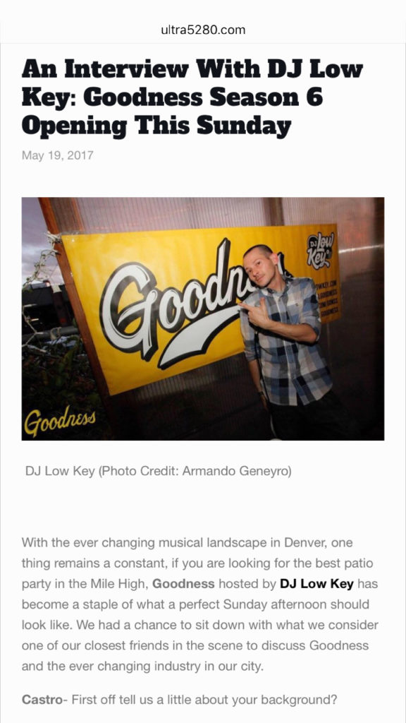 Posted on May 21, 2017Goodness founder/host/resident/etc DJ Low Key talks to Ultra5280.com about the party & lots more in advance of season 6… Read the full interview with DJ Low Key at Ultra5280.com, one of the best resources on the Denver scene…
