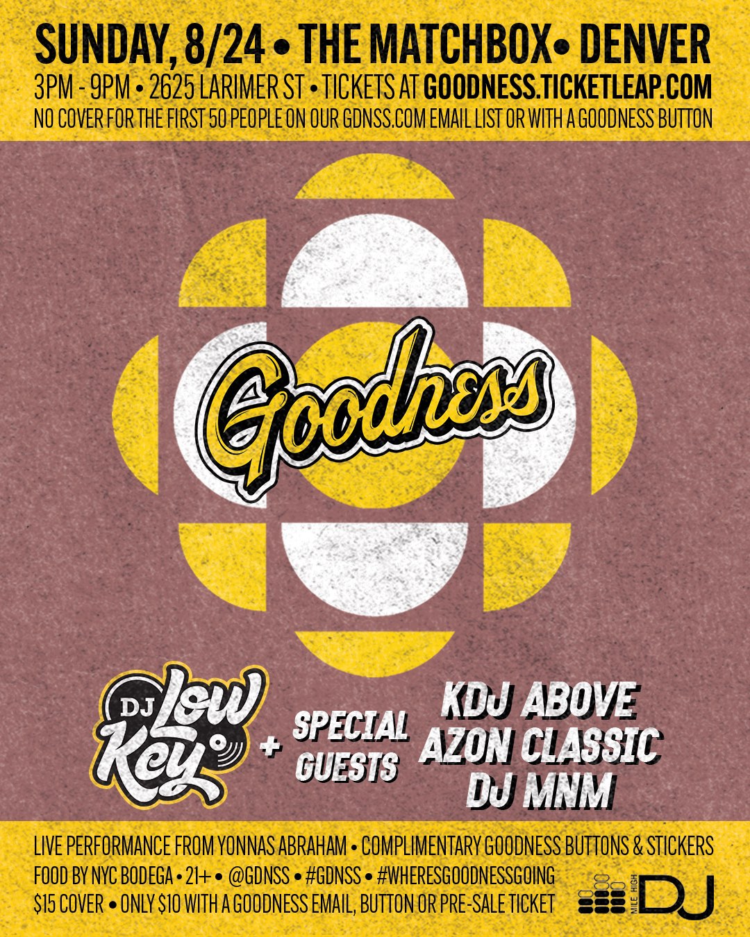CategoriesEvents, Goodness Denver TagsAzon Classic, DJ Low Key, DJ MnM, Goodness w/DJ Low Key & Friends, KDJ Above, NYC Bodega, The Matchbox, Yonnas Abraham