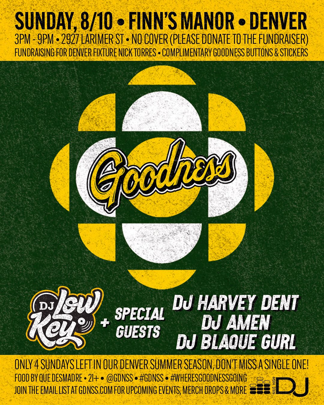 Sunday, 7/27 at 3pm -> Goodness w/ DJ Low Key + special guests DJ Chris Milly, Sugar Auntie & DJ E-Trane at Finn’s Manor! Fundraiser for Denver music fixture Nick Torres, food by NYC Bodega, our trademark aguas frescas, complimentary brand new #GDNSS buttons & stickers + lots more!